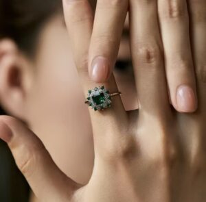 Anel em prata 925 com pedra central verde em destaque, rodeada por delicadas zircônias cravejadas que intensificam o brilho da peça. Um design sofisticado e elegante, perfeito para quem ama joias marcantes e cheias de charme.